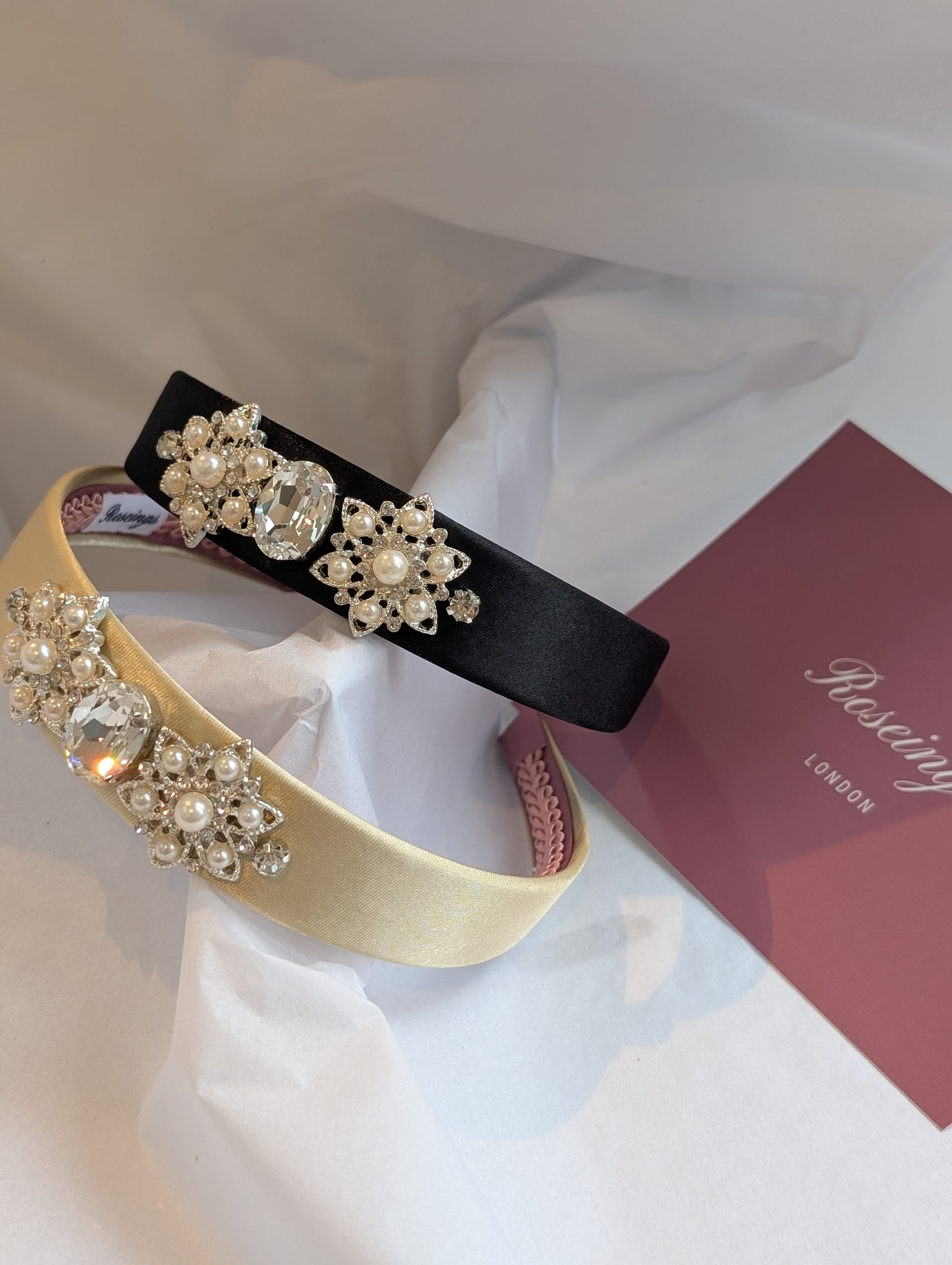 This satin little number has rhinestone and faux pearl embellishments with clear glass crystals to catch the light and the eye.